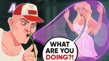 An ugly brute trapped a young beauty inside a pink bubble