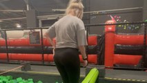 A bear falls out a three onto a trampoline when people are shooting him because he is on a private property