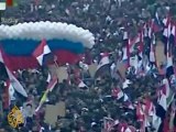 Hundreds of flag-waving supporters of President Assad greeted Lavrov on his arrival in the Syrian capital.