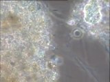 Observation d'un échantillon daté de 15 jours d'une boue de lavage, au microscope à fond noir (grossissement 50 fois et 100 fois), puis au contraste de phase (400 fois). Le biologiste explique en détail sa manière de procéder (concentration des biomasses avant examen) puis commente ses observations. A fort grossissement en contraste de phase, il identifie les espèces présentes : Pleuromonas (zooflagellé), suspicion d'Oligochète due à présence d'une soie longue typique, amibe nue et thécamibe (Chlamydophrys), colonie de bactéries avec gros exopolymère à la surface d'un floc, Entosiphon (zooflagellé), kyste ou grain de pollen épineux, suspicion de Difflugia.