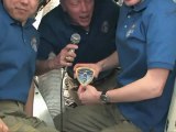 In the International Space Station Flight Control Room in Houston a traditional mission plaque hanging takes place with Expedition 29 Crew Members Mike Fossum & Satoshi Furukawa and the Expedition 30 live from the Space Station.