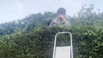 Backyard beast: Young boy tussles with the thorny thicket in the backyard
