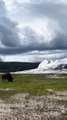 Bison broute alors que Old Faithful éclate