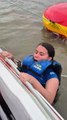 Woman Falls Into Water as Floating Tube Flips