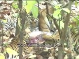 "Tiger with its cubs eating Cheetal in the jungle.