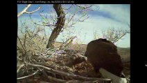 Thursday, April 25, 2013. Mom had just placed a small stick on top of her three week old eaglet and then starts to move some loose nest material around next to the little one as if to try a arouse it. It was reminiscent of my mother trying to get me to wake up and come to the breakfast table when I was very young. It takes a lot of patience and persistence on the mothers part, but after a while the young eaglet gives in, lifts it head and starts to eat. I'm happy to report that all is well at Fort St. Vrain.